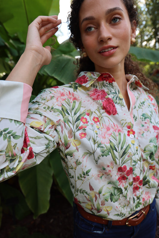 Find surprise details and mix-and-matched prints in the Lydia Cotton Button Down, inspired by the vibrant tiles, prints, and textures of the Caribbean and Spanish islands.