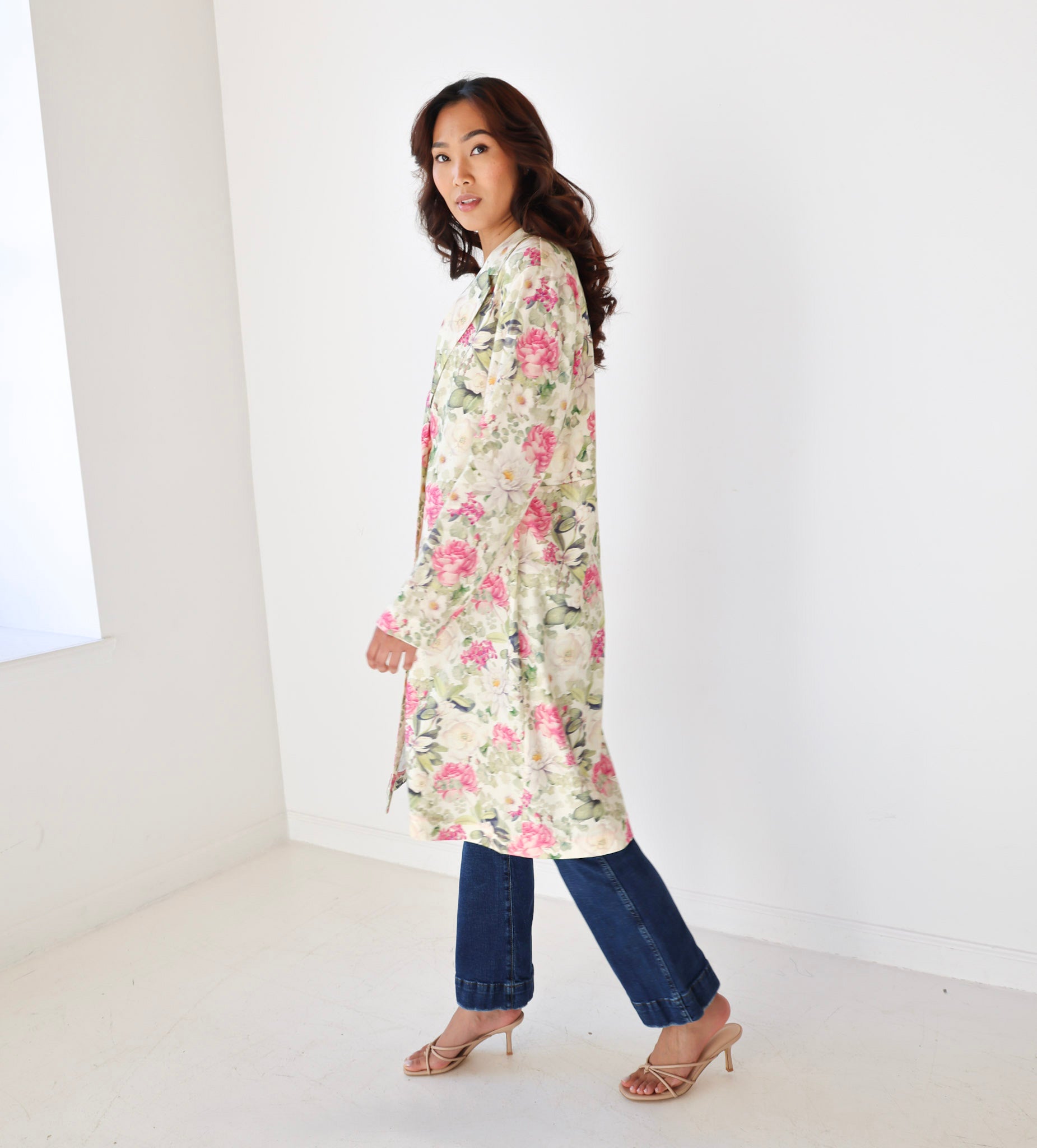 Live boldly in this stunning pink and green floral linen jacket, crafted from a lightweight, silky linen- rayon blend with 3% spandex for added stretch and comfort. Thoughtful details include a lustrous shell button, a partially floral lined interior, and decorative pink stitching for a unique finishing touch. Created in small batches, this limited-edition piece is as exclusive as it is breathtaking.